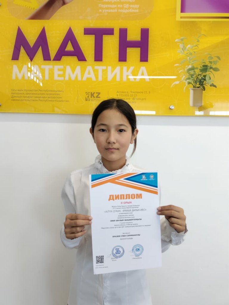 7 сынып оқушысы -Омар Аяулым 2 орын Дипломмен марапатталды