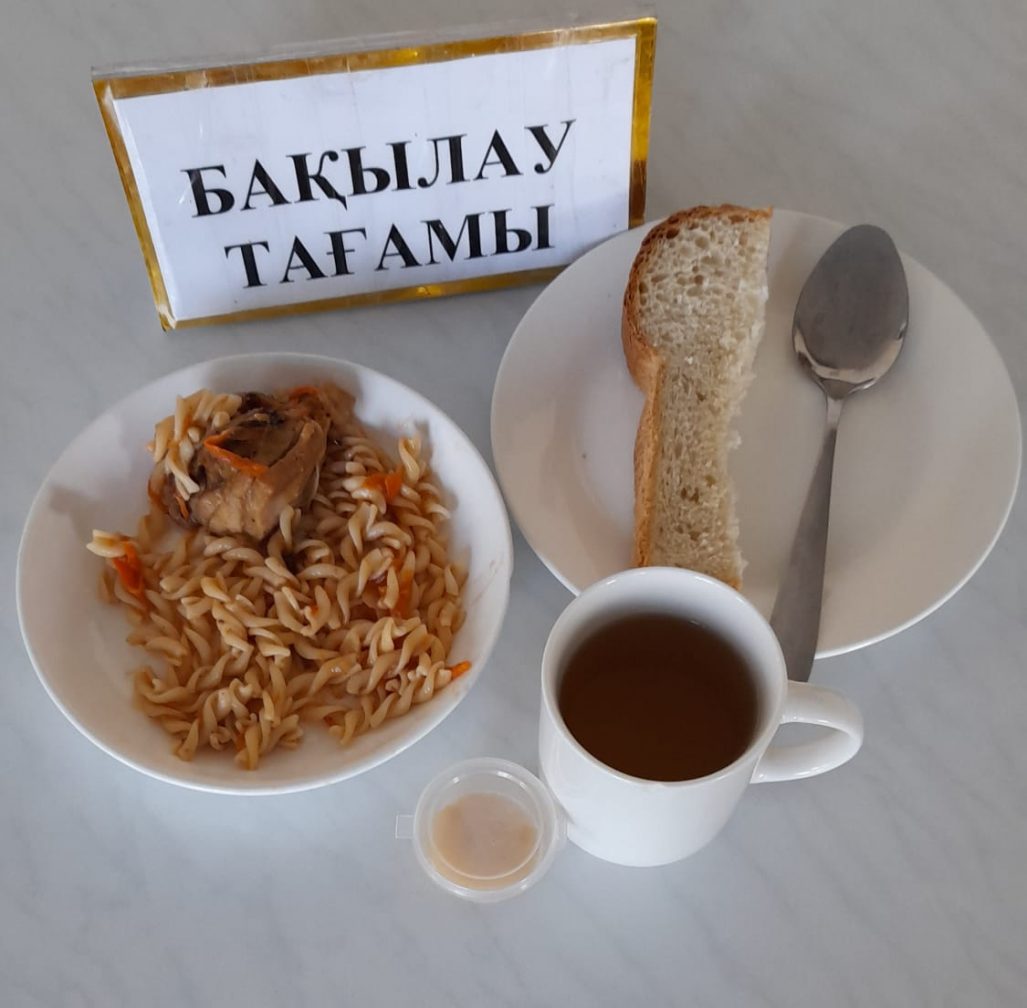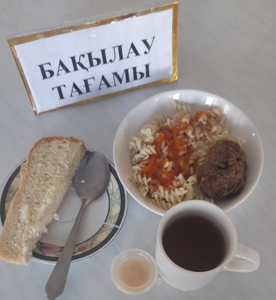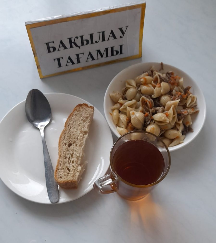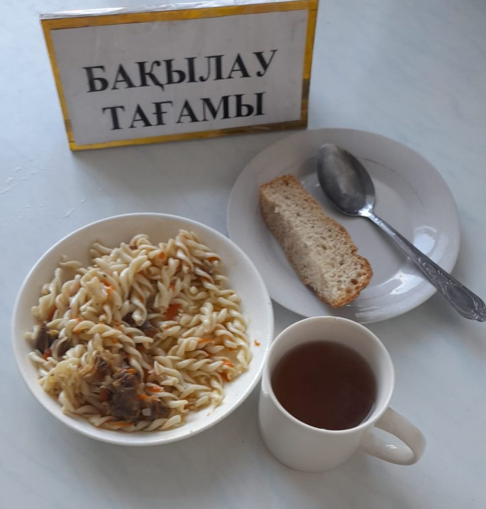 09.04 2025 жыл Ас мәзірі: Сиыр еті,макарон және май ,нан,қант қосылған шай.