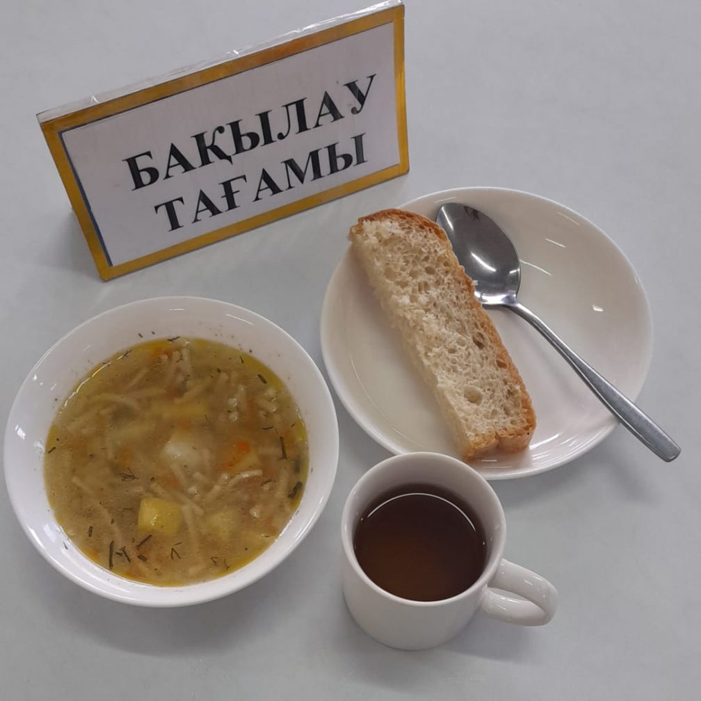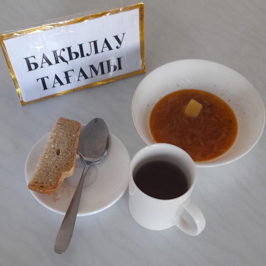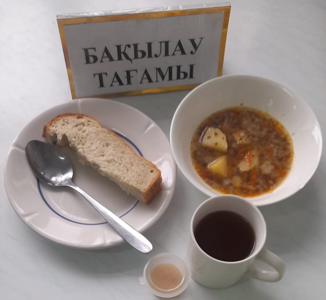 20 ақпан 2025 жыл Ас мәзірі: 1.Ет сорпасында қарақұмық сорпасы 2.Нан 3.Лимон мен қант қосылған шай 4.Бұқтырылған минтай балығы 5.Бал 6.Сәбіз қосылған қырыққабат салаты