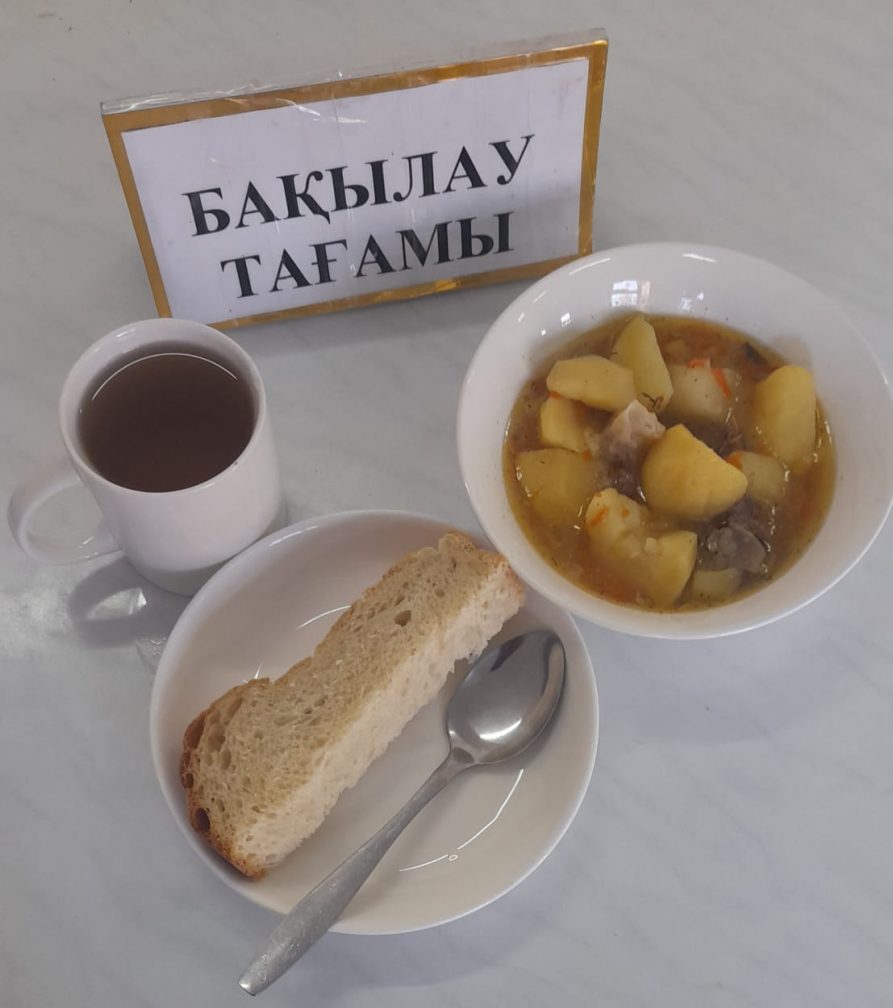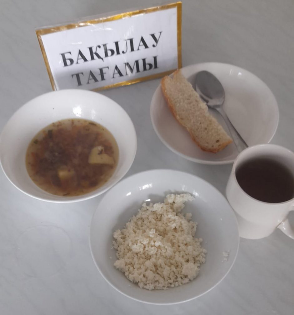 21 ақпан 2025 жыл Ас мәзірі: 1.Қарақұмық қосылған сиыр гуляшы 2.Нан 3.Табиғи шырын 4.Сүзбе