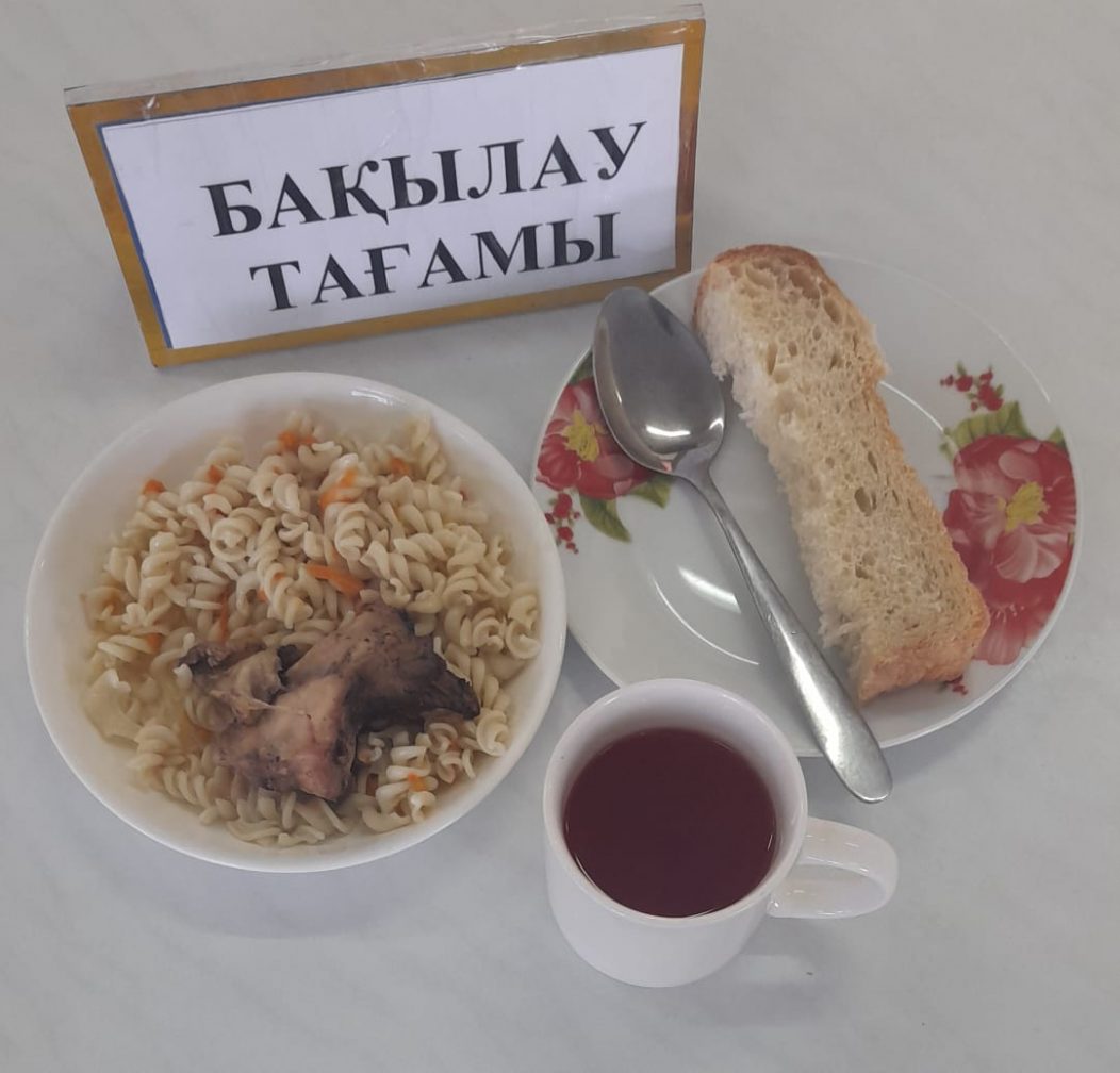 05 ақпан 2025 жыл Ас мәзірі: 1.Сиыр еті котлет қосылған макарон 2.Нан 3.Кептірілген жеміс компоты 4.Тоқаш