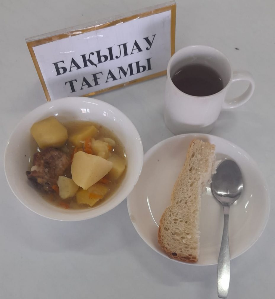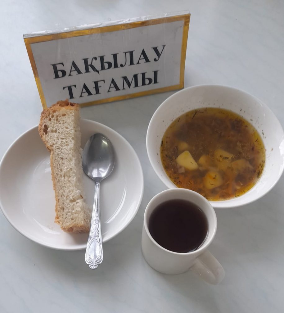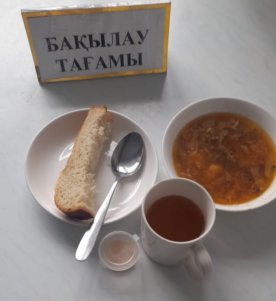 06 ақпан 2025 жыл Ас мәзірі:1.Сиыр еті қосылған тары сорпасы 2.Нан 3.Лимон мен қант қосылған шай 4.Бұқтырылған балық 5.Бал 6.Сәбіз қосылған қырыққабат салаты.