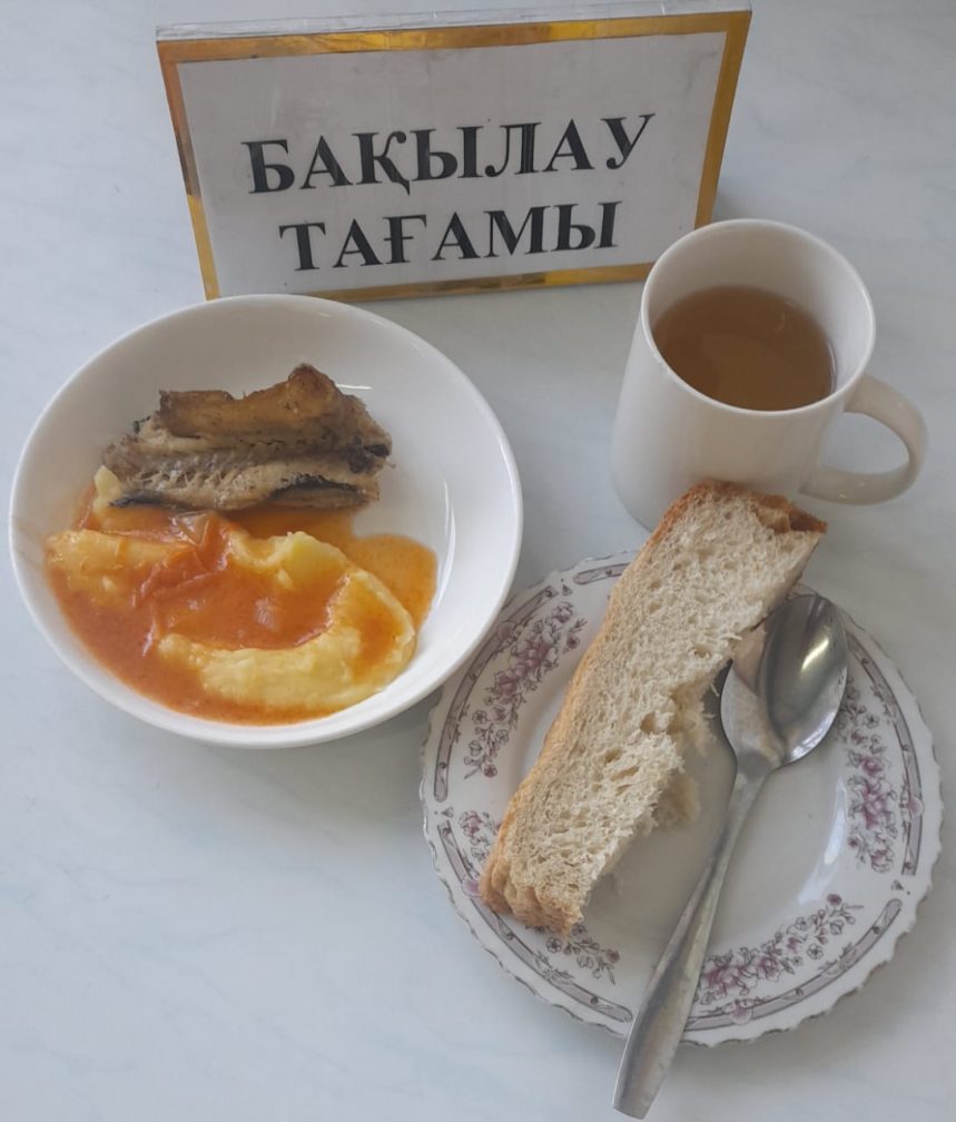 30 қантар 2025 жыл Ас мәзірі:1.Сиыр сорпасындағы тары сорпасы 2.Бұқтырылған балық 3.Нан 4.Лимон мен қант қосылған шай 5.Көкөніс салаты 6.Бал